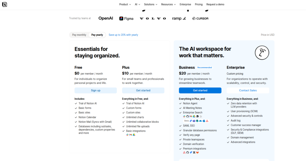 Notion offers a tiered system depending on your needs. If you pay yearly, you can save up to 20%.
